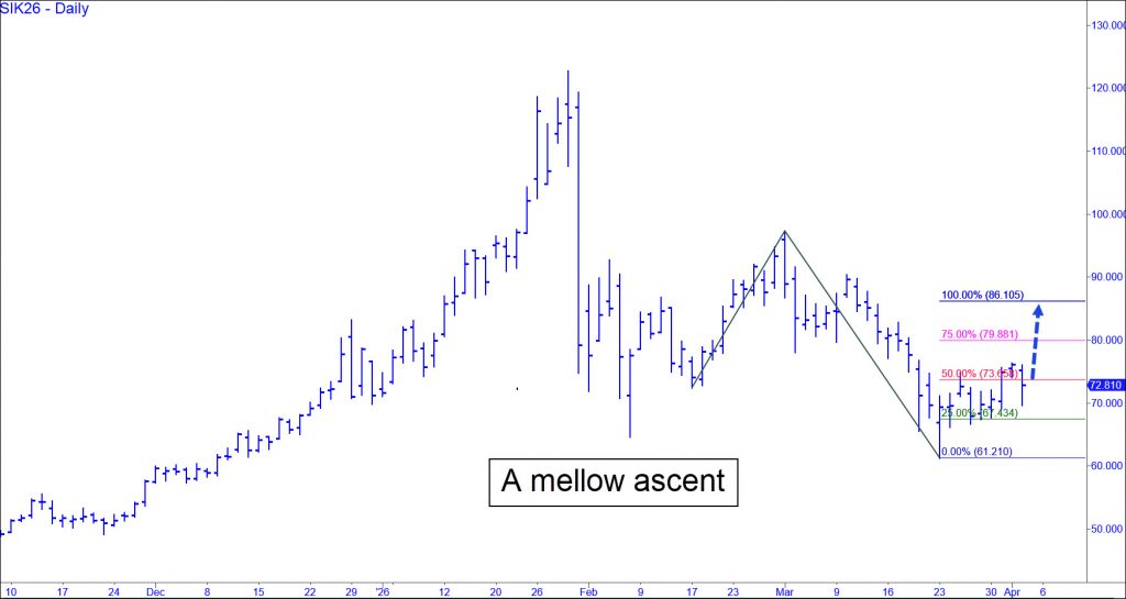 It took the futures several days to get off the launcher following the ‘buy’ signal noted here a week ago, but by Friday they were on their way to an all but certain rendezvous with the 104.94 target shown. Because investors are obsessed with oil’s every move, we can infer
