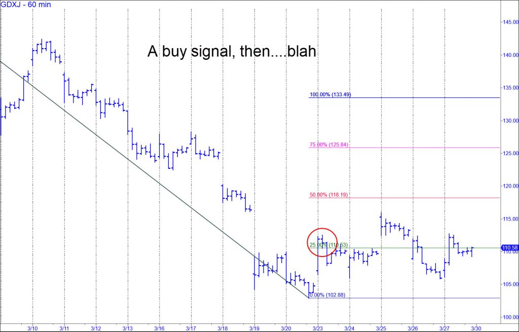 Like Gold futures, this ETF proxy for junior miners spent the week in timid remission. Although it triggered a theoretical ‘buy’ signal on Monday, the follow-through failed to reach the midpoint Hidden Pivot resistance after four days of flailing. That could chain in a trice, however, presumably with a jump-start