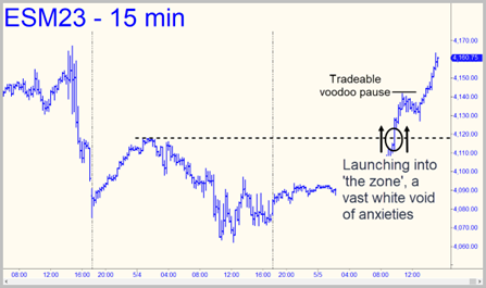 Similarly, a price spike into a chart’s discomfort zone can vex the eye of the trader who is poring over a chart in real time. Would you believe that these spikes often peak in places that can be predicted without arithmetic? You must literally see this to believe it, and to understand exactly how an odd visual effect can translate into easy bets that risk little, even in violent markets.