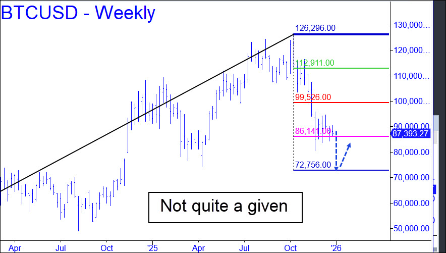 I’ve modified my outlook and coordinates following last week’s punk performance and am now projecting more downside to the 72,756 target shown. However, the short-term picture would brighten moderately if the bounce from Friday’s low exceeds 87,903. Thereafter, a pullback to 87,236 would signal a (very) short-term buy with a