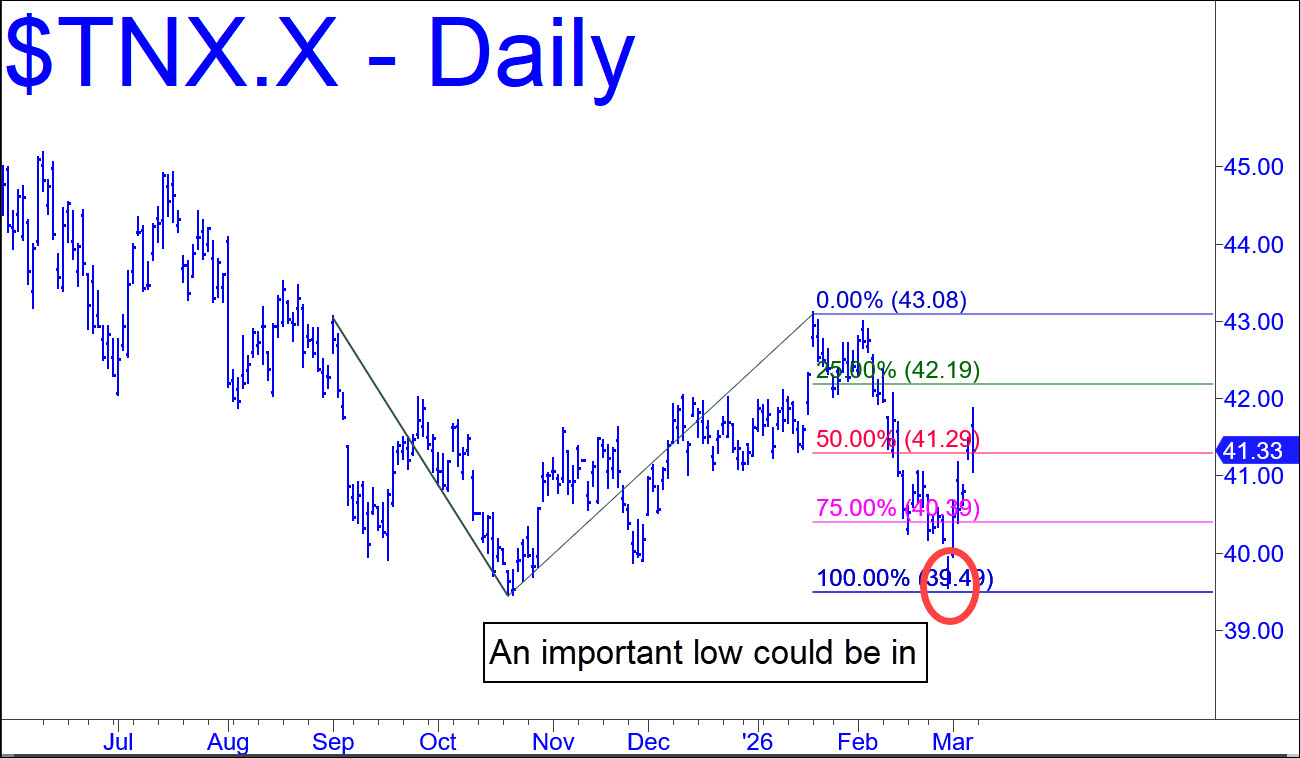 Rates on the 10-Year Note came within a hair on Friday of lows not seen since October. My suggestion is to enjoy it while it lasts, since the intraday bottom closely coincided with a Hidden Pivot target at 3.952%. The actual low was 3.956%, which was near enough to consider the target fulfilled. Alternatively, if the downtrend continues on Monday, breaching not just the target but October’s 3.976% bottom, be ready for more slippage to 3.917%, a voodoo number worth bottom-fishing with as tight a stop-loss as you’re comfortable with. _______ UPDATE (Mar 7): It looks like the prediction of an important low hit a bullseye, since this vehicle has since trampolined as high as 4,188 after bottoming a split hair from the 3.952 target. Here’s the chart.