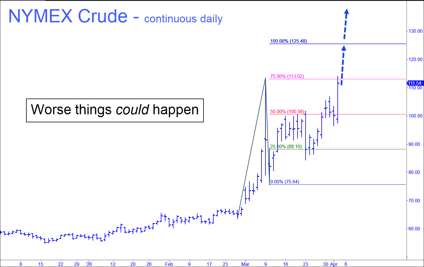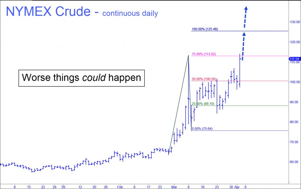 The graph says Wall Street ought not get its hopes too high for quick relief, since crude looks like it could rise to te sky before quotes settle back to a more normal $70 or so. How will Wall Street react if prices reach the $125-a-barrel target in the graph, or maybe even higher? Actually, buyers have shown unmistakable signs of mental illness, but with a seemingly benign twist. Before Tuesday, the broad averages had lurched both ways on a hair trigger, moving inversely with every blip up or down in crude. But on Tuesday they did something so bizarre that no one could have predicted it. With oil up a few dollars, stocks went bonkers, uncorking an 1100-point rally in the Dow. More of this nutty behavior surfaced again on Thursday, which started with oil prices up a whopping 14% overnight. Instead of cowering in fear, however, the S&Ps exploded into a nearly 100-point rally. Crazy, right? Trouble is, the rally came off a deeply oversold low that DaBoyz had engineered ahead of the opening bell. The resulting short squeeze put the S&Ps merely even on the day – still an absurdity considering the dire news from the energy patch.